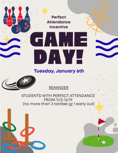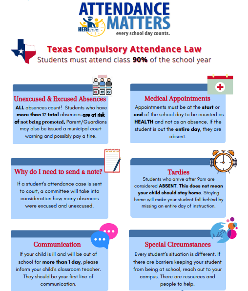 Parents: The district attendance goal is to be at 95% or higher for our daily attendance. Please help us boost our campus attendance! Students need to be in school to learn. Thank you for partnering with us to increase our campus attendance. Check out our next attendance incentive happening in November!