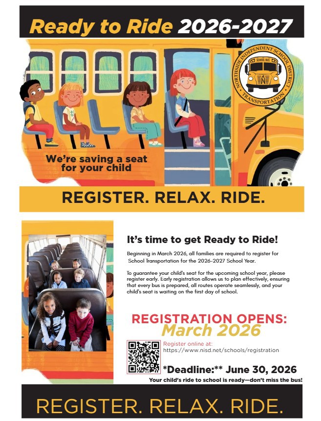 Bus: Students riding the bus are located in areas identified by NISD as being outside of the 2 mile radius or in an area with obstructed pathways such as our areas under construction. Drivers maintain lists of approved riders. Students not on the approved list of riders will not be placed on the bus. If your child rides the bus and walks home from a bus stop, please practice how your child should go safely from the bus stop to home.