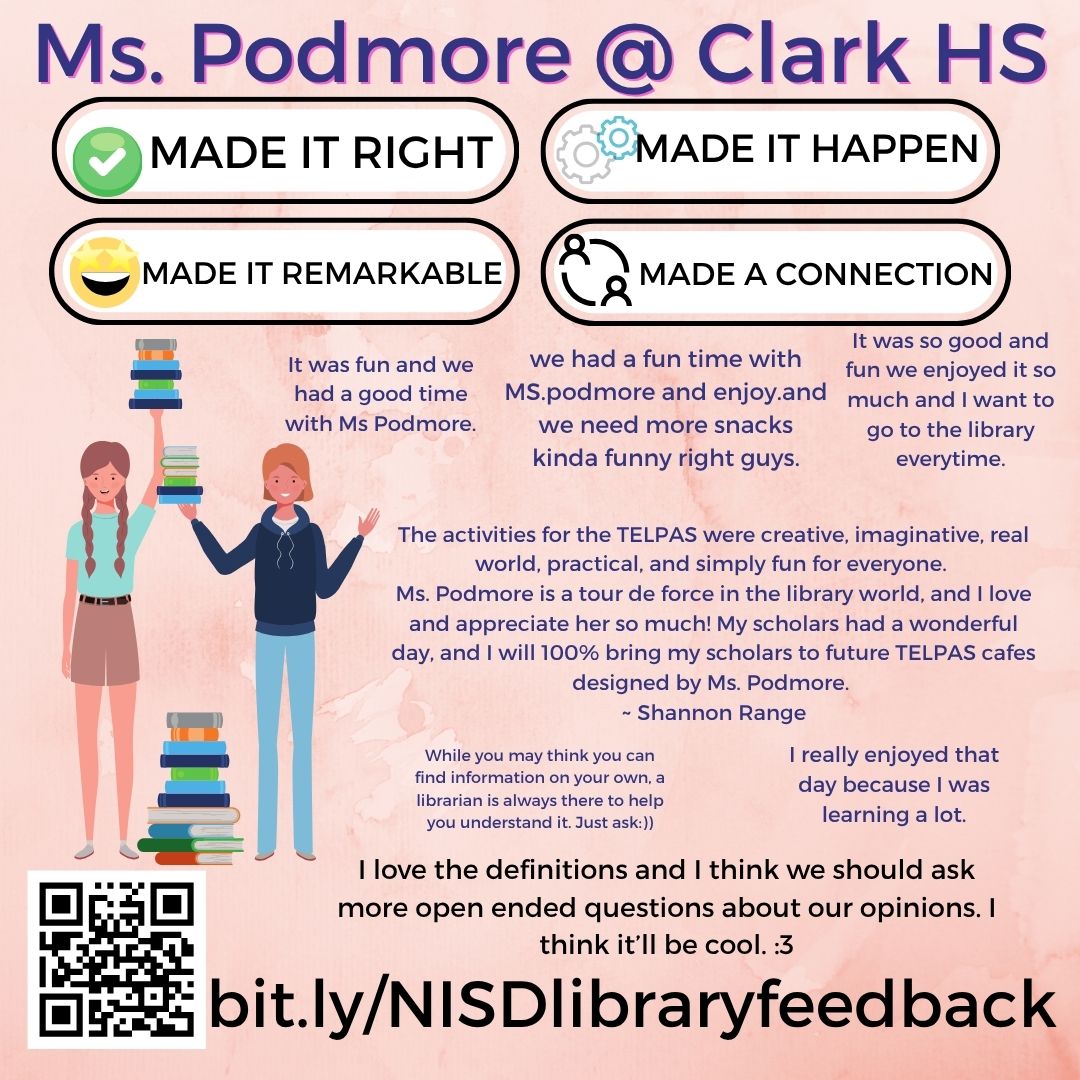 Librarian Lucy Podmore has served the Clark community since 2016. She loves collaborating with teachers, putting great books in the hands of our students, building community and helping plan LibraryPalooza, the best teen author festival in San Antonio! Email is the best and fastest way to reach Mrs. Podmore