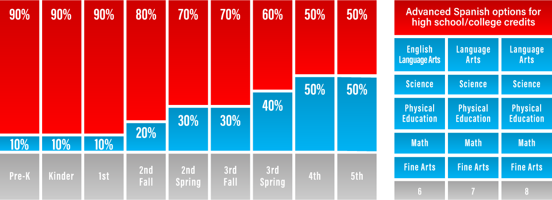 Teachers use many strategies to make the content understandable, such as visuals, props, manipulatives, facial expressions, gestures, physical movements and many other instructional techniques. The teachers also repeat vocabulary and concepts and always check for understanding. Teachers do not expect your child to speak the second language right away. The students are not forced to speak the second language and they are initially allowed to speak English/Spanish. The teacher will restate what your child says to reinforce connection between the Spanish and English vocabulary or vice versa.