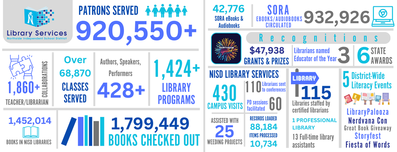 Northside ISD has a total of 117 campus libraries and a professional library located at NAC that circulates professional material to teachers all over the district. All NISD libraries are staffed by professional, certified librarians. High school libraries also have a paraprofessional library assistant. Studies consistently find positive relationships between having access to full-time, qualified school librarians and student performance.