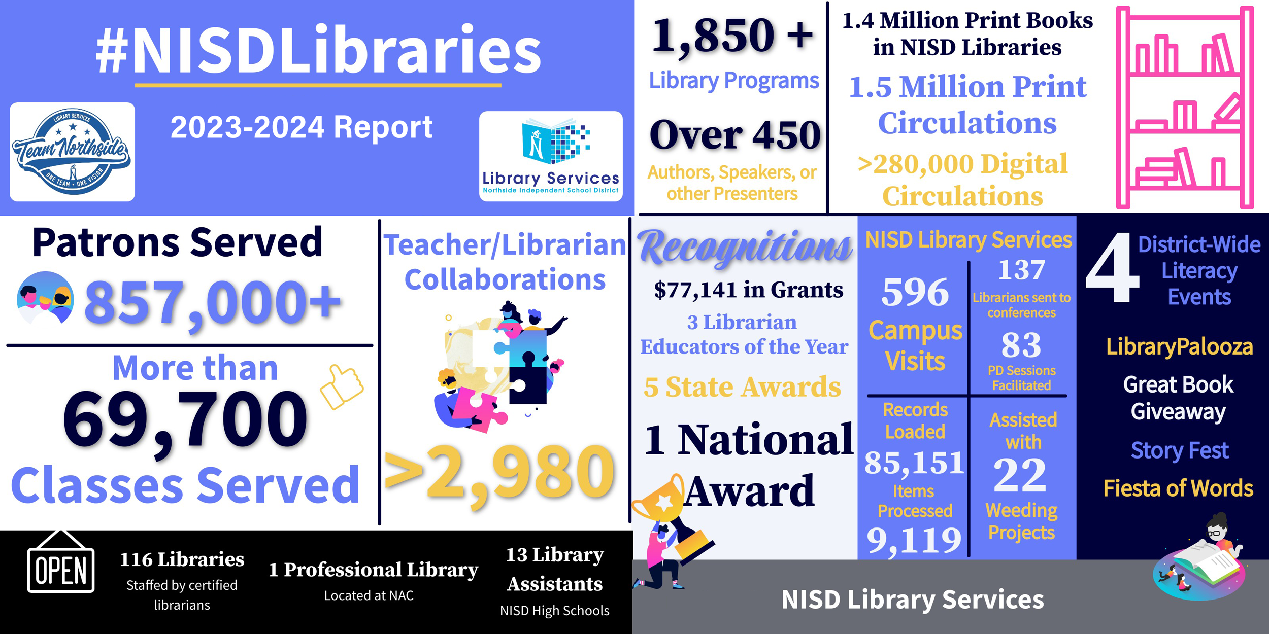 Northside ISD has a total of 116 campus libraries and 1 professional library located at NAC.