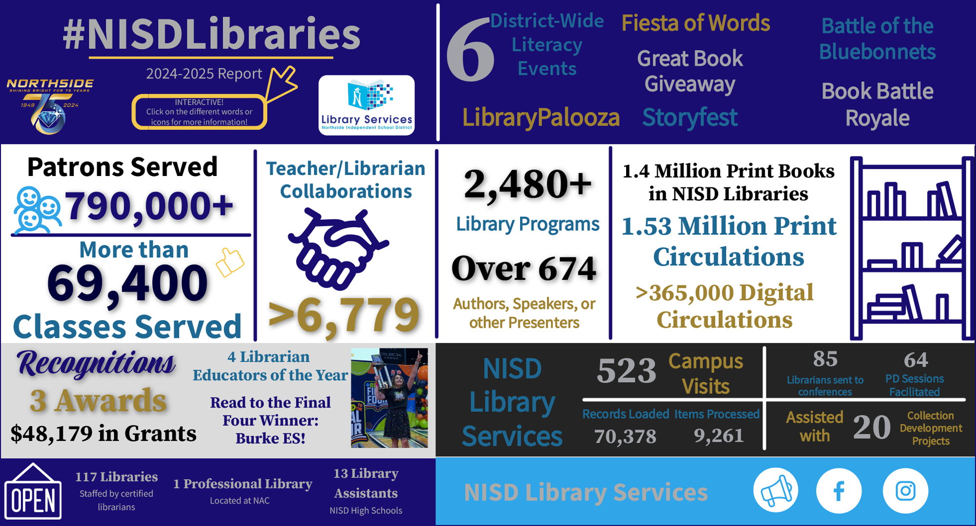 #NISDLibraries serve as hubs for our schools: gathering places for students, staff and families. They are a safe space for everyone on campus, offering a variety of lessons, activities, and opportunities. Students can use the library to read, study, create, explore, and more! This number represents individual visits by students, teachers, parents, and other patrons.
