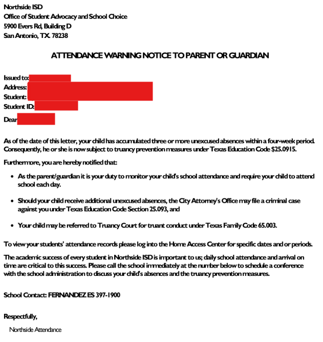 Please be sure to communicate with your child's teacher and send a note in if they will be absent. Once a student has accrued 3 unexcused absences in the system, NISD will generate an Attendance Warning Notice that will be emailed to the parent/guardian. This Attendance Warning Notice is added to your child's school record. An example of what you will receive is shown here.