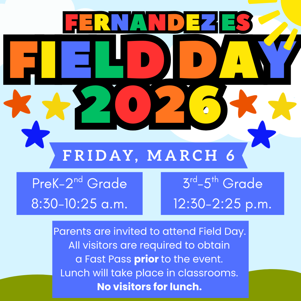 To help ensure a smooth entry process, all parents must obtain a Fast Pass prior to Field Day. If you do not have a current Fast Pass, stop by the office to obtain your Fast Pass. Fast Passes must be completed in advance—there will not be time to process them the day of the event. No visitors for lunch.