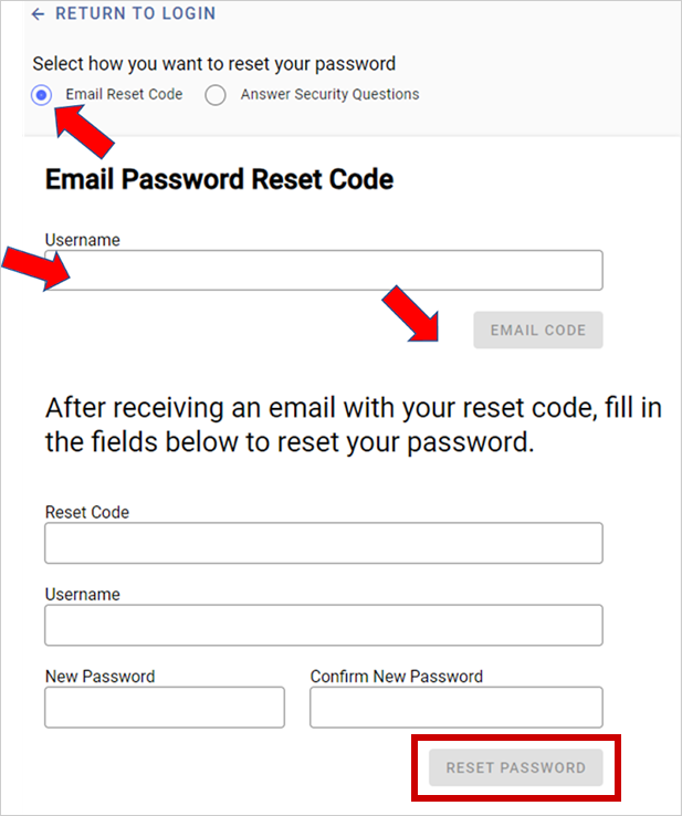 - After receiving the email with your reset code, complete the fields to reset your password.