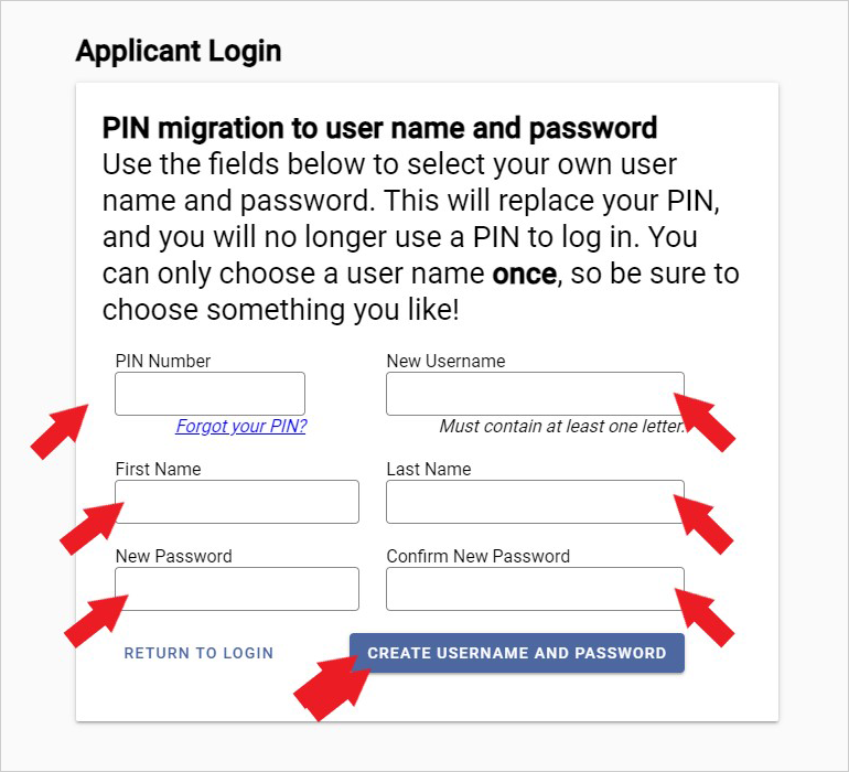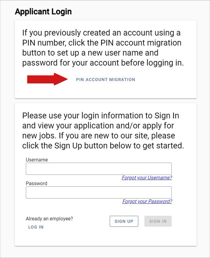 Since the last time you applied, our system has updated the login page. You will need to complete a pin account migration, (changing your pin number to a username and password). Once you complete the migration, you will login with your username and password.
