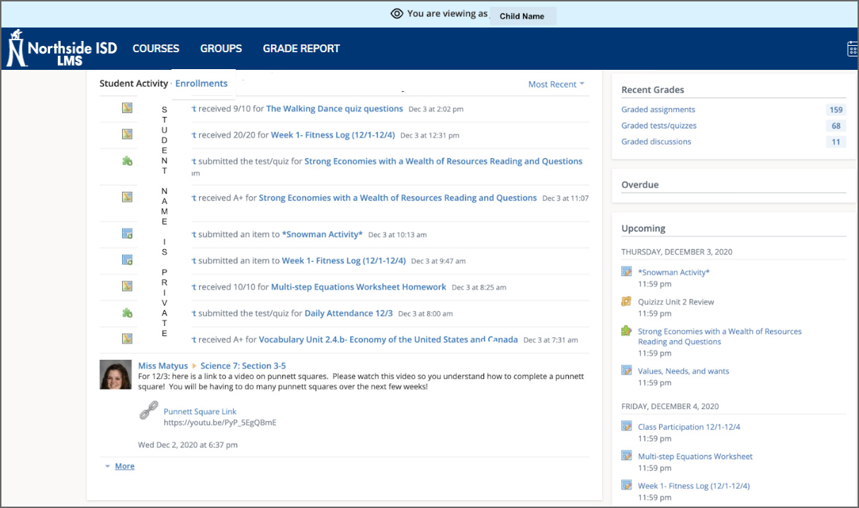 The Student Activity area in the center of the page displays your child’s Recent Submissions, Grades, Overdue, and Upcoming Assignments.