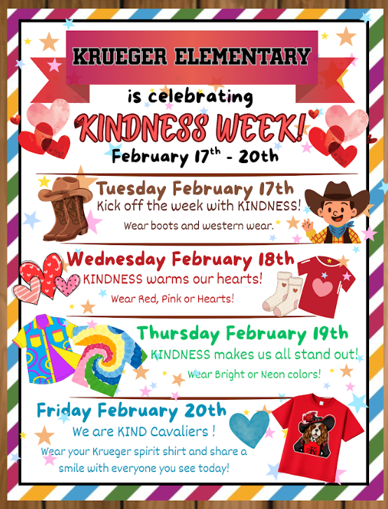 Get ready! Kindness Week kicks off this Tuesday, Feb. 17th, and runs through Friday, Feb. 20th. We canโt wait to see our students show off their spirit by participating in each day's special theme!