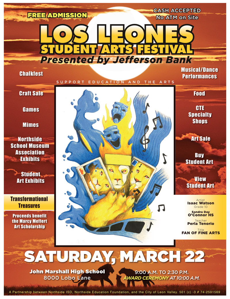 The inspiration and collaboration of former Leon Valley Mayor Marcy Meffert and NISD Fine Arts Director James Miculka, Los Leones was developed to encourage student artists and help them to learn “the business of art,” while establishing an active arts community in the city of Leon Valley.