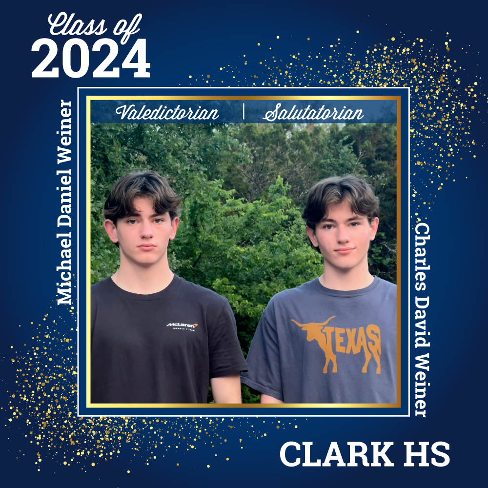 Charlie Weiner is the salutatorian of Clark High School. He plans to attend The University of Texas at Austin, majoring in Finance and pursuing a career as an attorney.