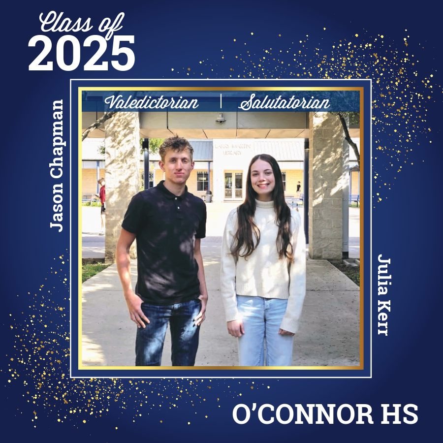 O’Connor High School Valedictorian, Jason Chapman, will attend Texas A&M University in College Station, majoring in Neuroscience, with his future career undecided. His leadership roles included team captain of the varsity tennis team (11-12) and vice president of the Science National Honor Society (12).