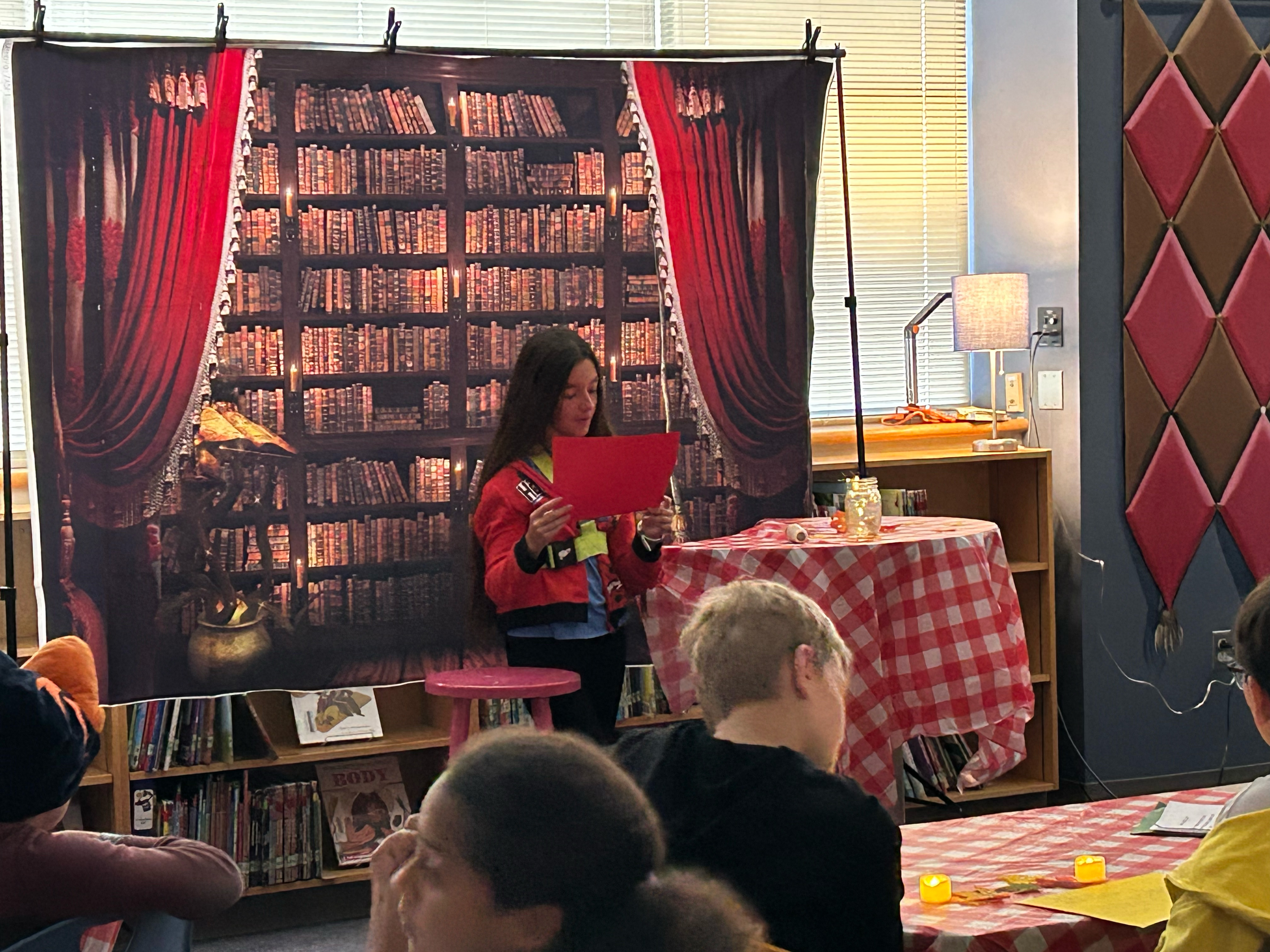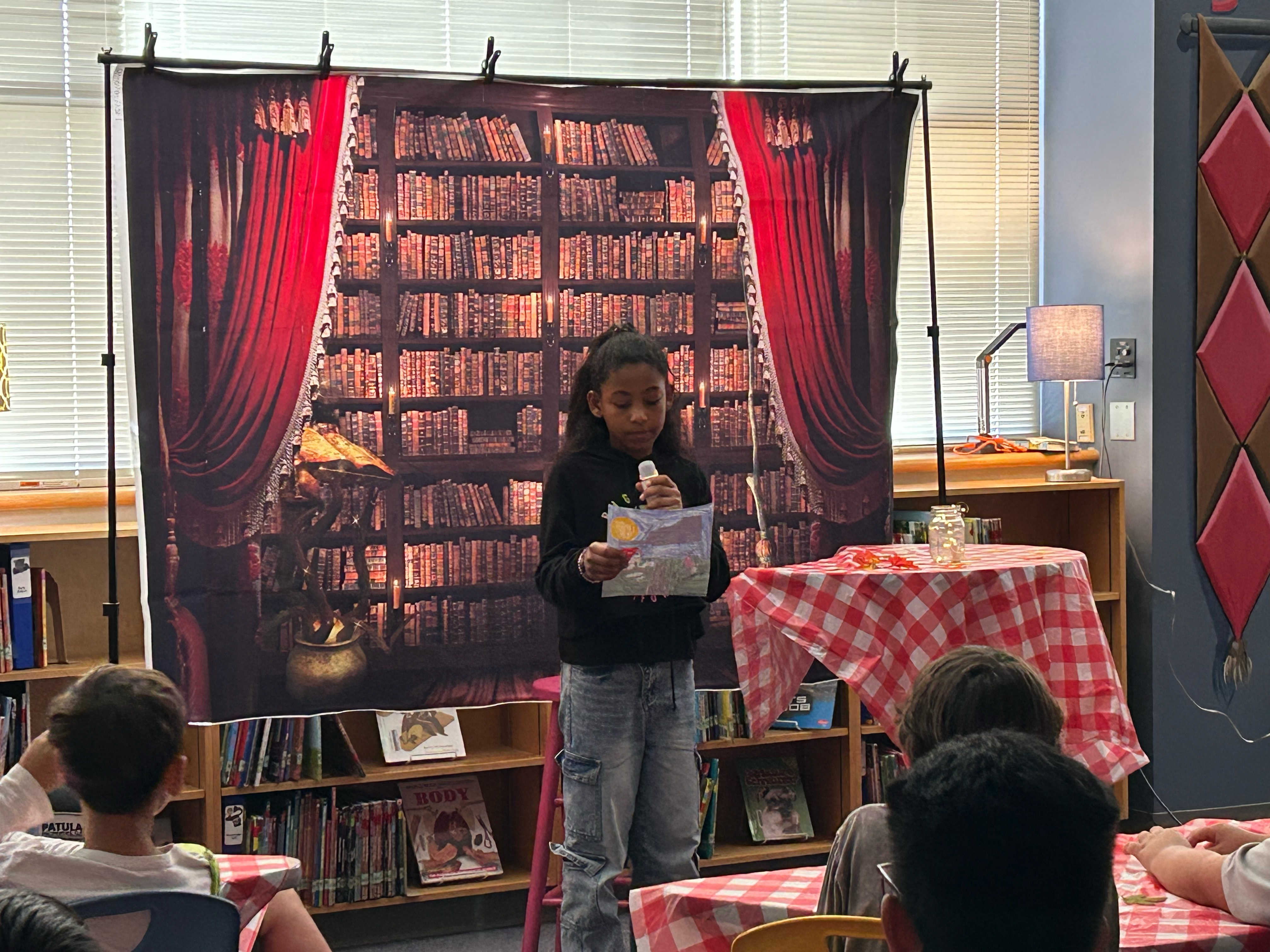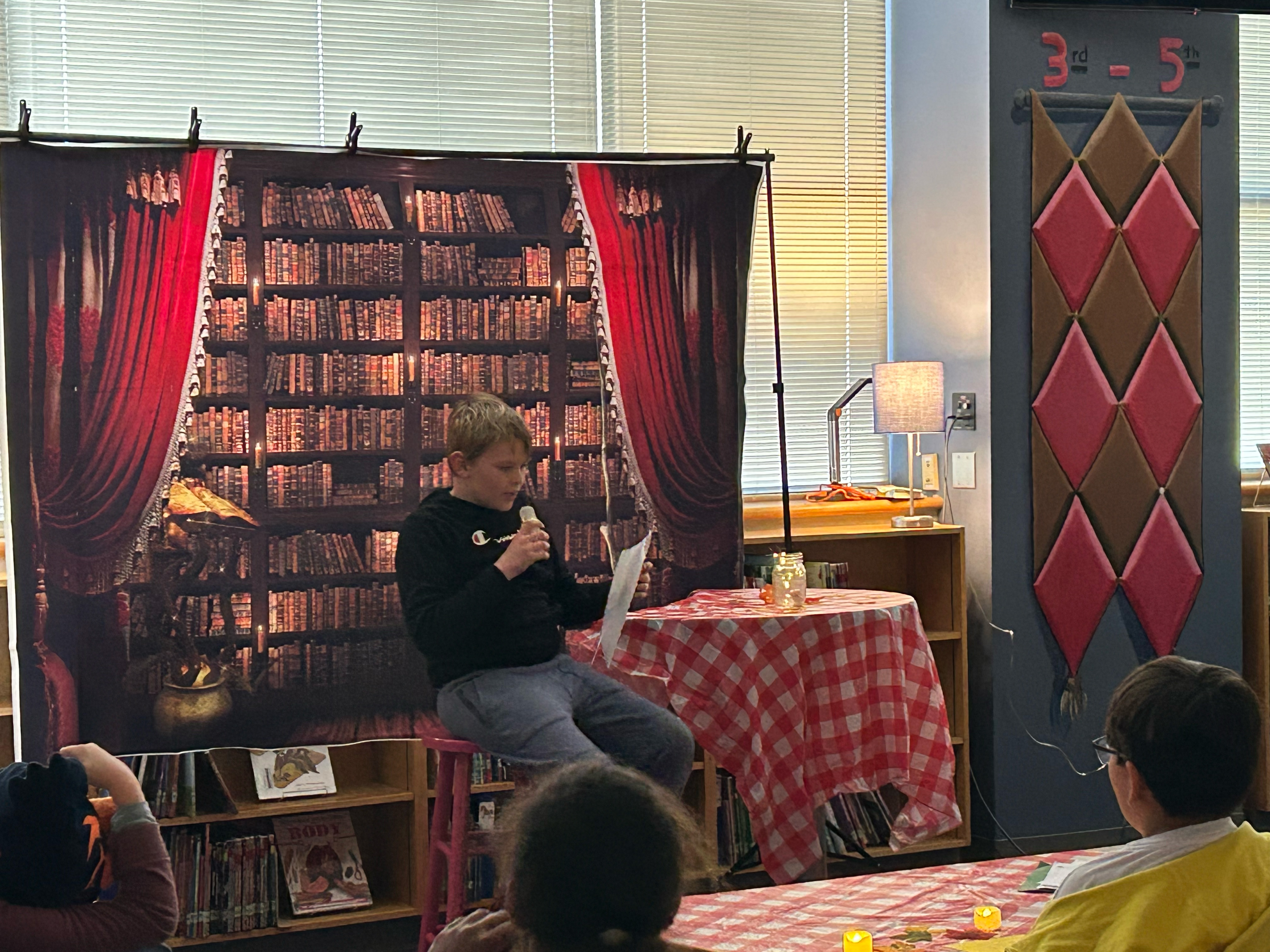 Led by Librarian Mrs. Parker and fifth-grade teachers Mrs. Wheeler and Mrs. Fritz, the school library was transformed into a cozy, café-style venue complete with soft T-light “candlelight” and comfortable seating that set the mood for an afternoon of thoughtful expression.