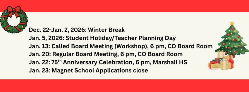 As the year comes to a close, we want to extend our sincere gratitude for your dedication, professionalism, and care for our students and community. Your commitment makes a meaningful difference every day, and we are truly thankful for the work you do. We wish you a joyful holiday season filled with rest, reflection, and time with those you love. May the new year bring renewed energy, good health, and continued success.