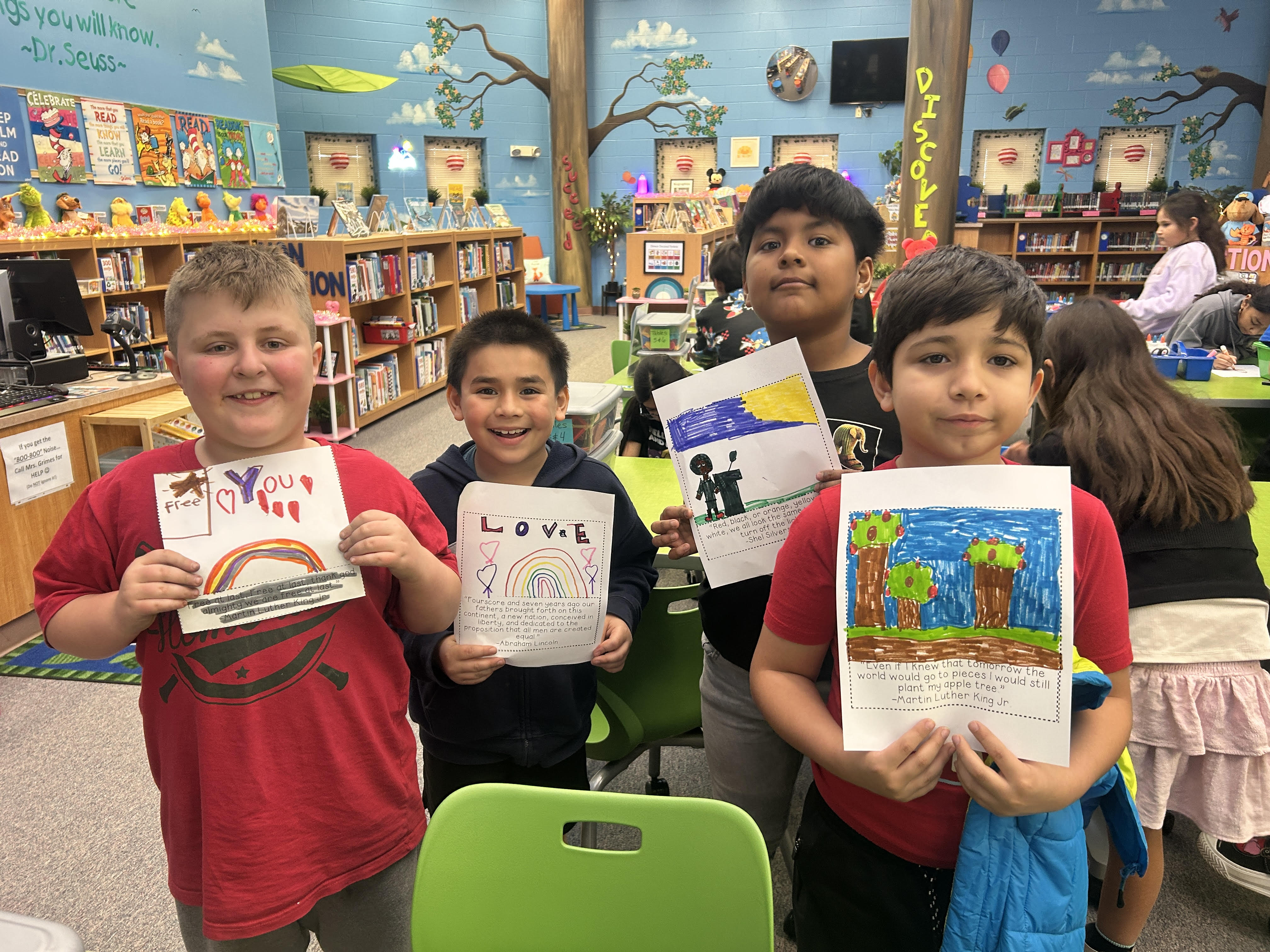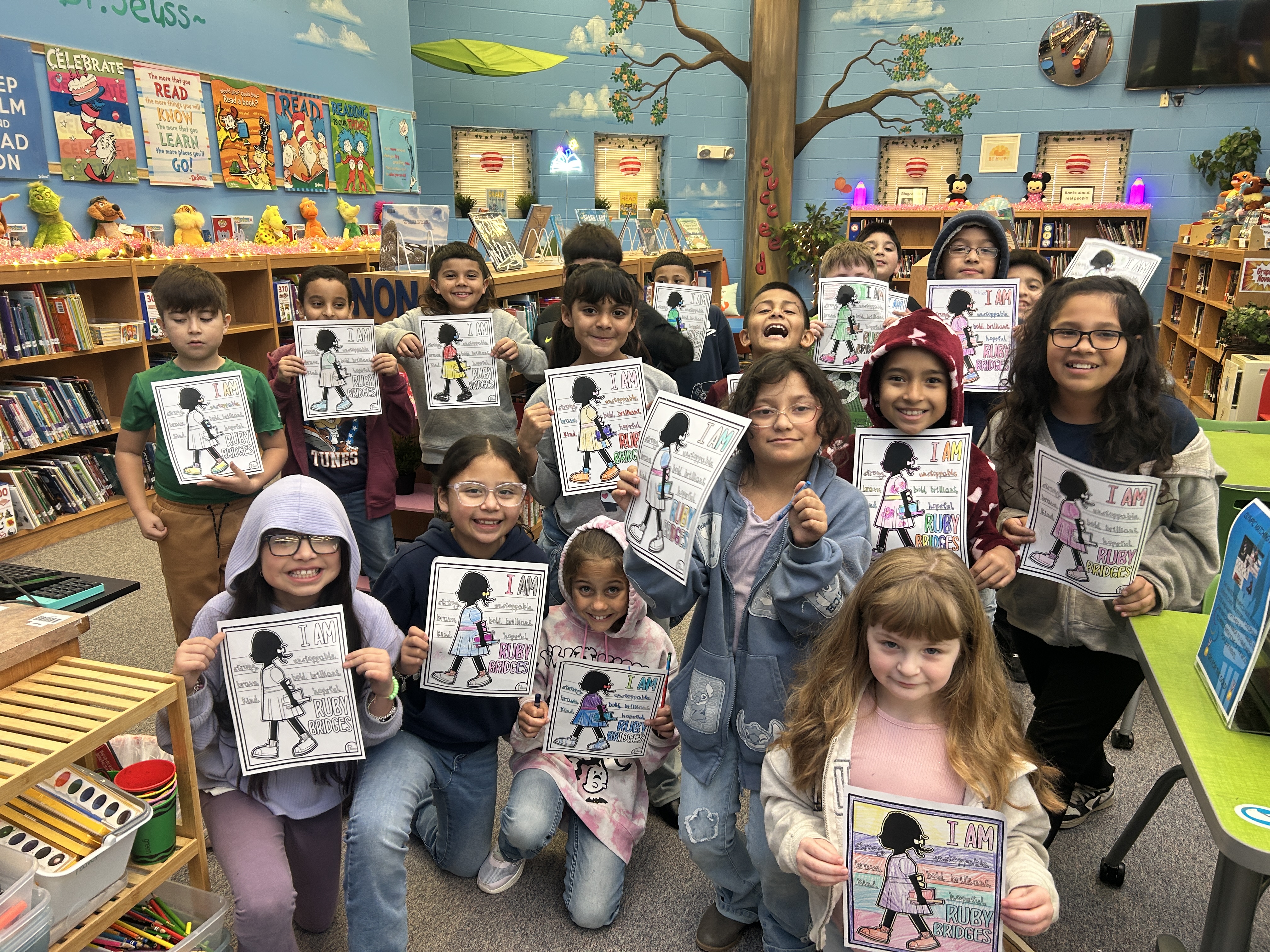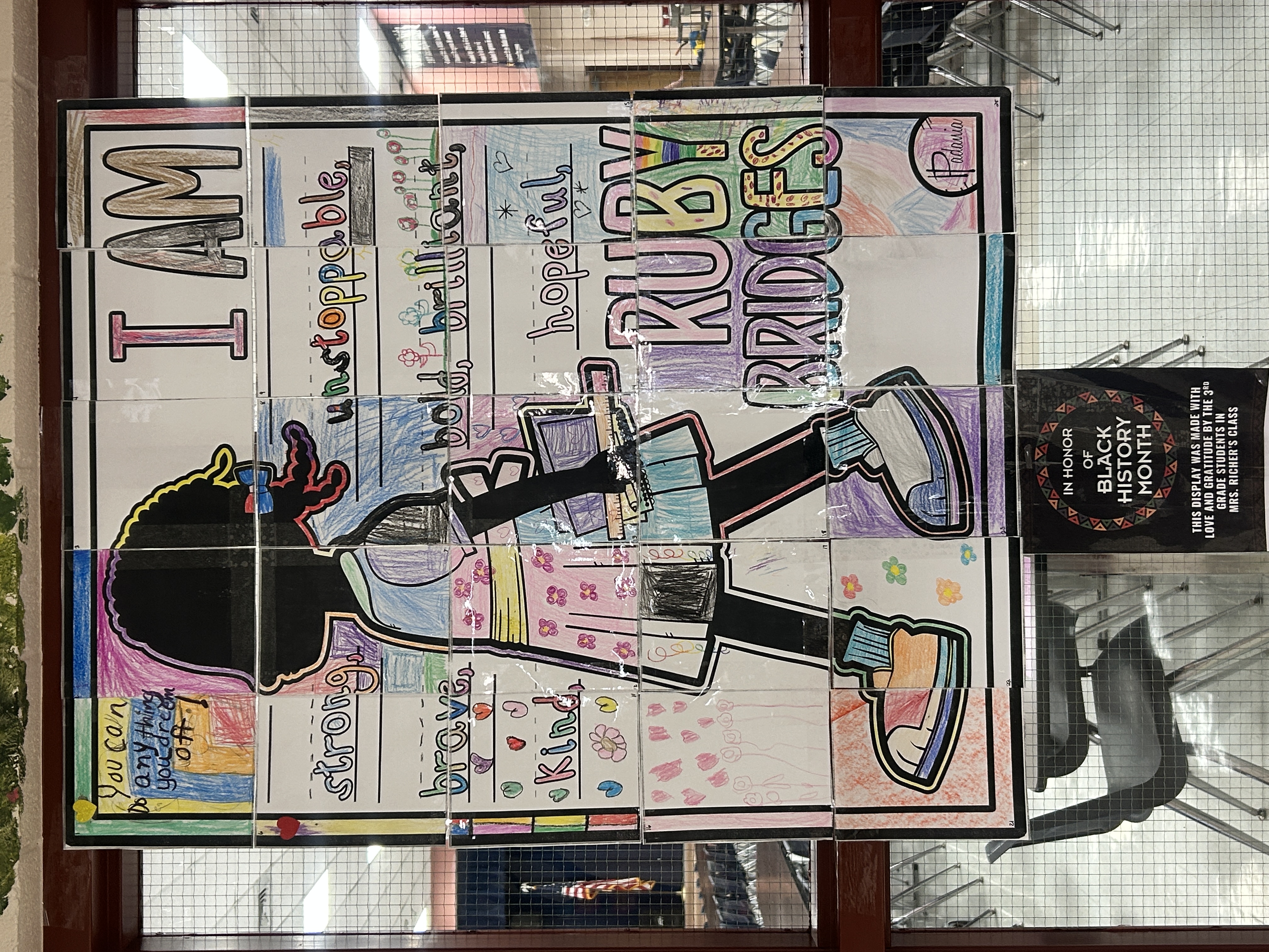 In honor of Black History Month, the 3rd-grade classes at Valley Hi collaborated with campus librarian Jennifer Grimes on a social studies and art-based service project. One class created a collaborative poster, and the other class worked on a Freedom Quilt after their library lesson on Black Heritage Month and a shared read-aloud of Ruby Bridges's autobiography. The students were so joyful to see how they are part of a bigger picture and can make a difference just by spreading positive messages and working together.