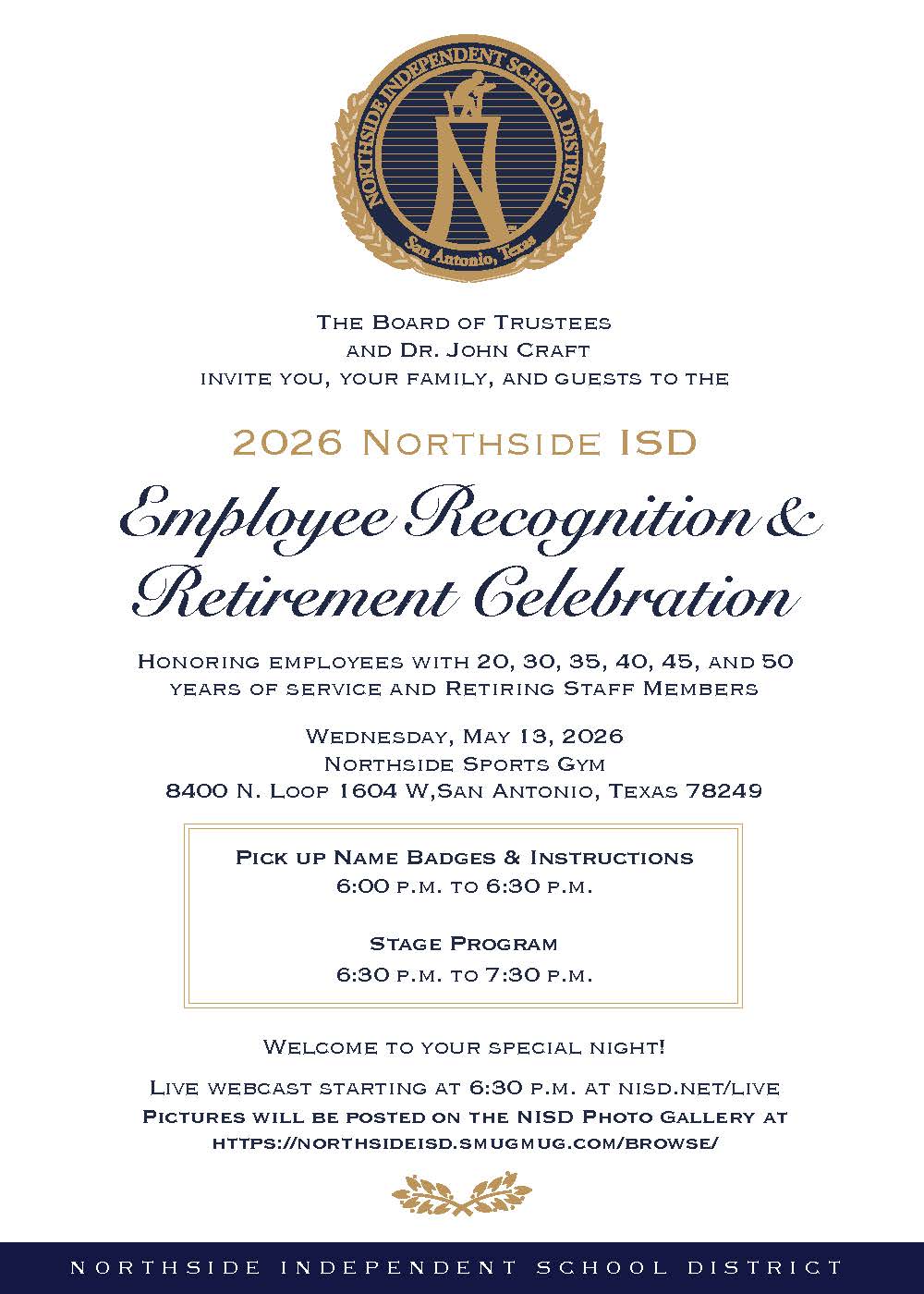 The NISD Retirement and Recognition Celebration is scheduled for Wednesday, May 13, at the Northside Sports Gym beginning at 6:30 p.m. The annual event honors employees with 20, 30, 35, 40, 45, and 50 years of service, as well as retiring staff members.