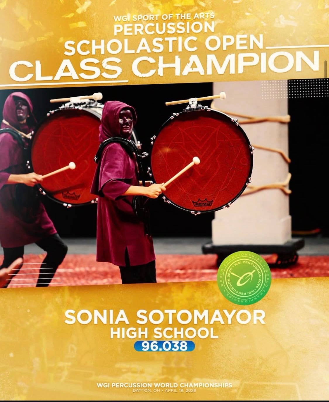 Sotomayor Indoor Percussion has reached the pinnacle of the marching arts, capturing the title of WGI Percussion Scholastic Open World Champion. In a stunning performance at the WGI World Championships in Dayton, Ohio, Sotomayor rose to the top of a massive field of 52 elite high school ensembles.