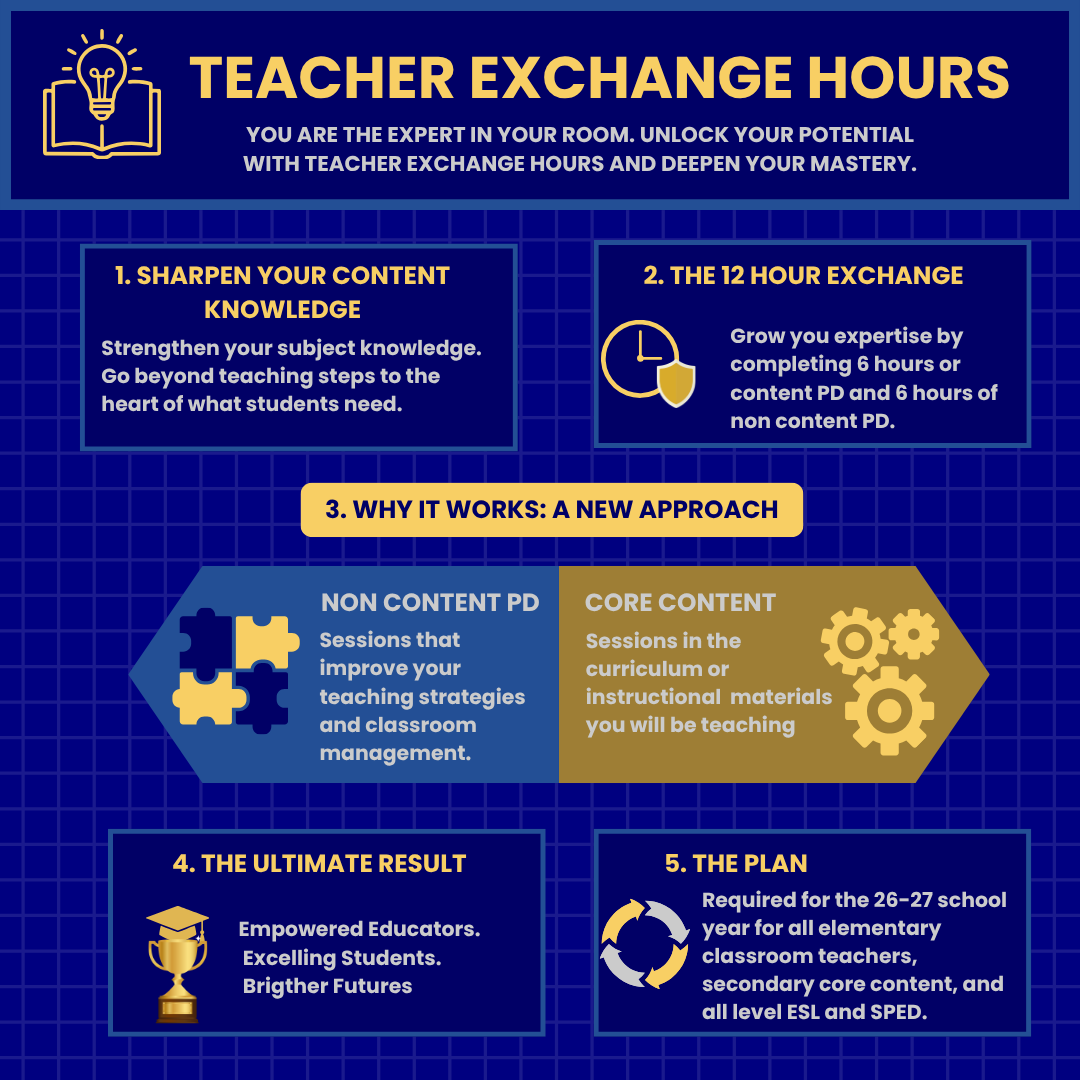 Starting May 1, 2026, our professional learning program is officially transitioning from Teacher Choice Hours to Teacher Exchange Hours. You may have seen this noted in the academic calendar. For the 2026-2027 school year, teachers, nurses, librarians, counselors, and other designated positions must complete 12 hours of professional learning outside of standard contract time between May 1, 2026, and April 30, 2027.