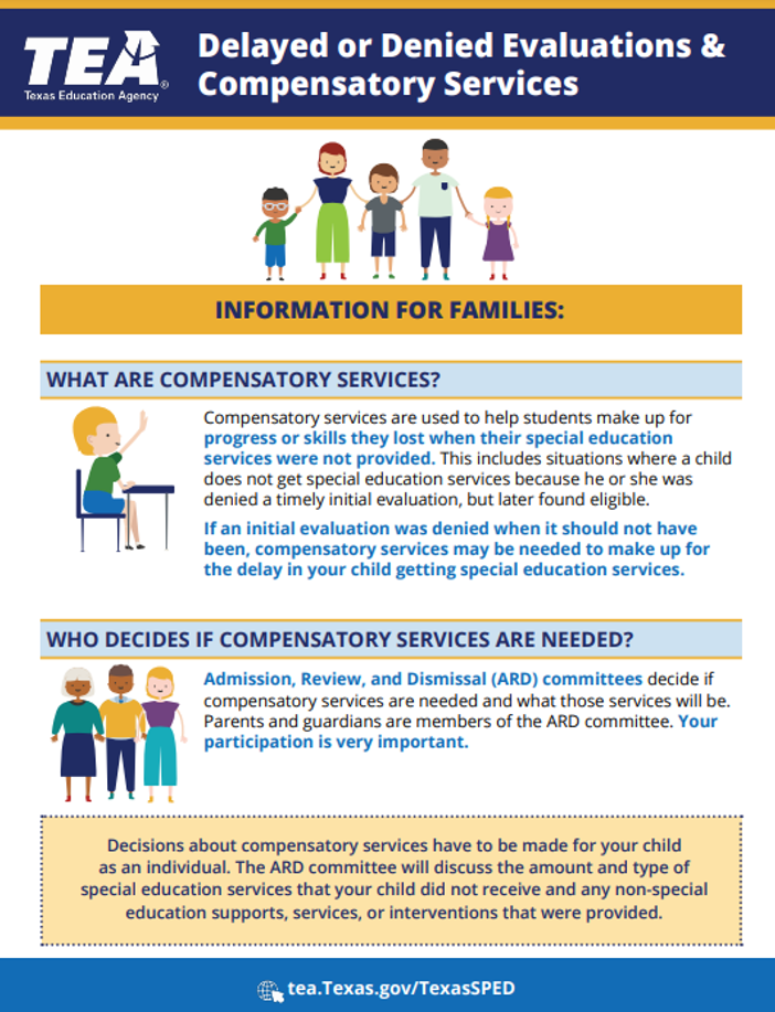 Below is a document to assist parents whose children may have been previously delayed or denied an evaluation under the IDEA in requesting compensatory services for their child. You can also visit the TEA website for more information.