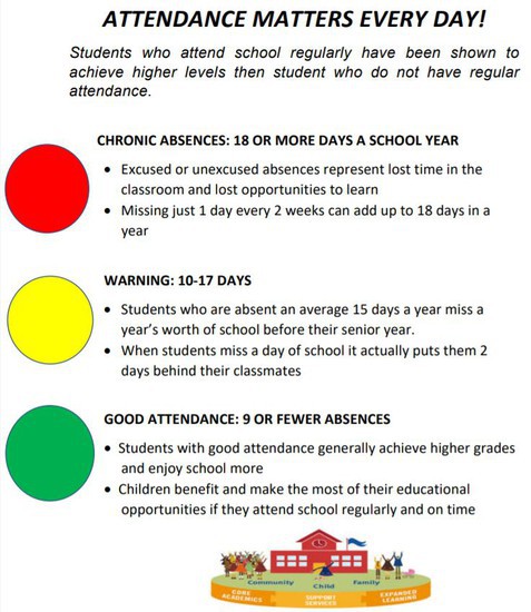 As a reminder, not only do absences lead to learning loss, they can also lead to social-emotional deficiencies. We encourage all parents and students to make school attendance a top priority except for time when the student is sill. Be sure to send a note upon your student's return to school.