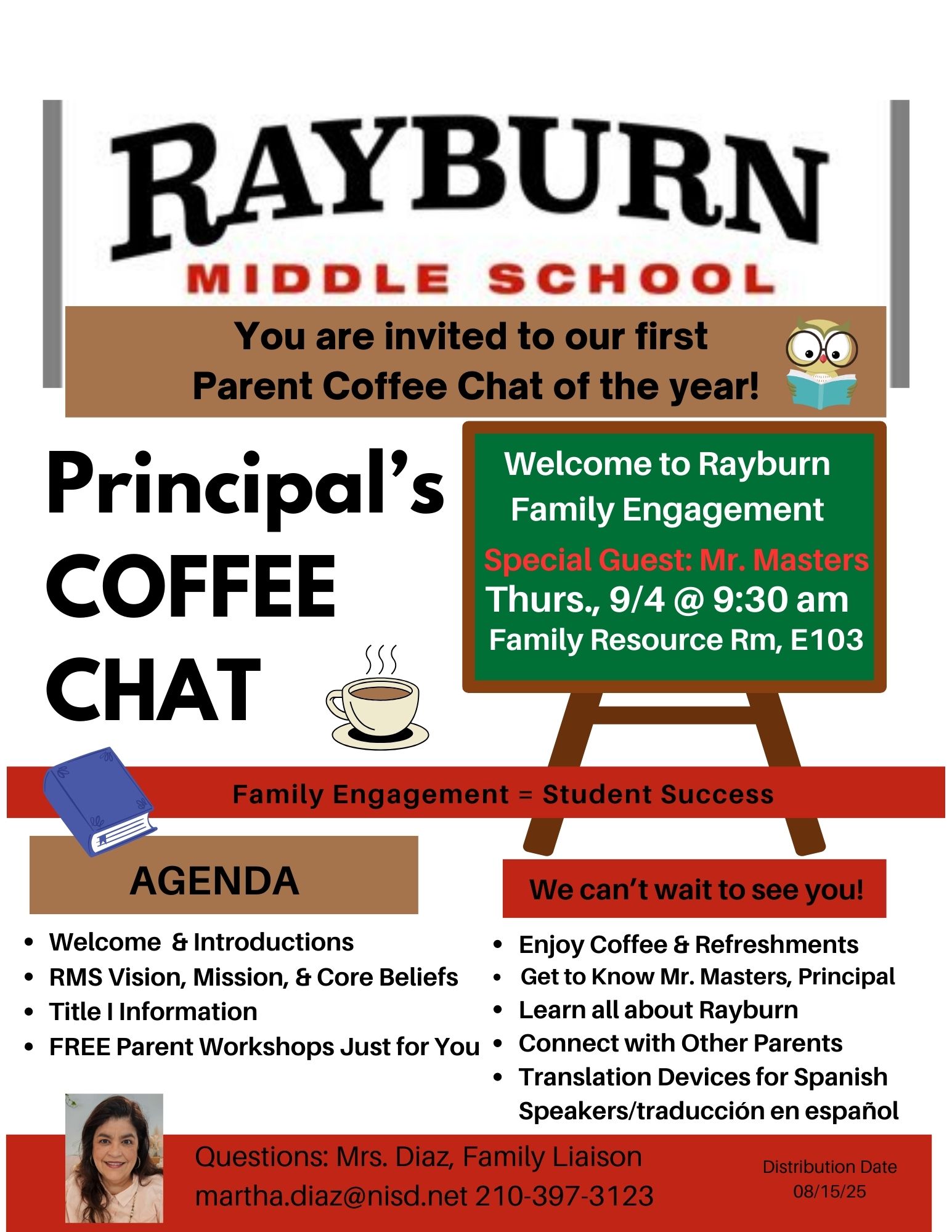 Welcome back! We are excited to start our Family Engagement sessions for parents, caregivers, and community members! Mark your calendars as September has some great offerings. Our first session is our Principal's Coffee Chat on Sept. 4th at 9:30 am. We hope you will join us as we get to know Mr. Masters our Principal and learn all about Rayburn! Translation devices will be available for those who prefer Spanish. We are excited to see you!