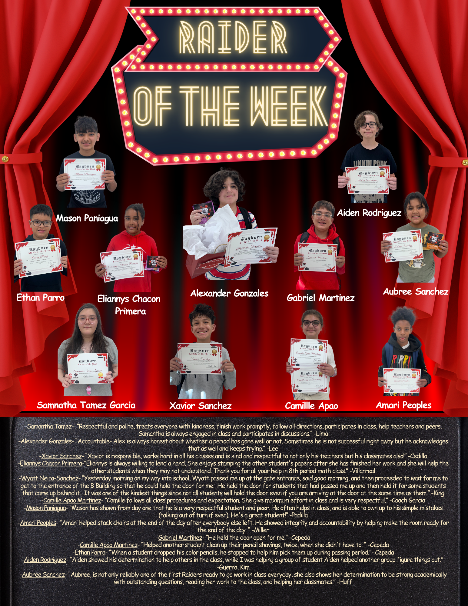 Rayburn believes that a strong school community is built on a foundation of excellent character. To recognize and foster the positive behaviors that make our school a great place to learn and grow, we are excited to announce our Raiders of the Week!