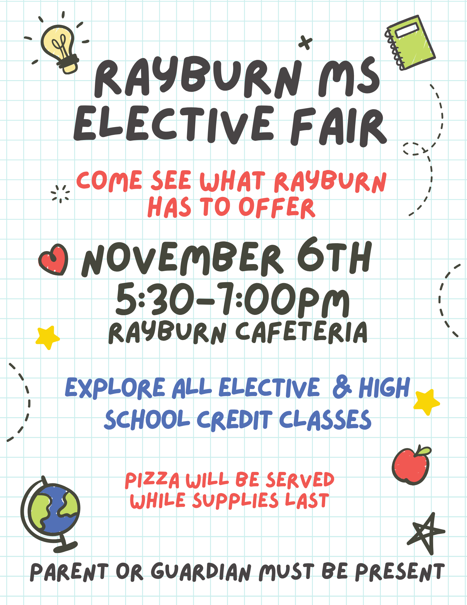 Also, don’t miss our upcoming Elective Night! This is a great opportunity for students and families to explore our elective courses, school organizations, and high school credit options. Be sure to complete your passport during the event for a chance to win a raffle prize!