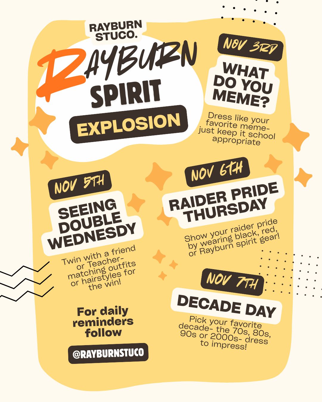 Get ready for our Rayburn Spirit Explosion, running November 3rd–November 7th! Each day, students can join in the fun by dressing up and showing their school spirit: