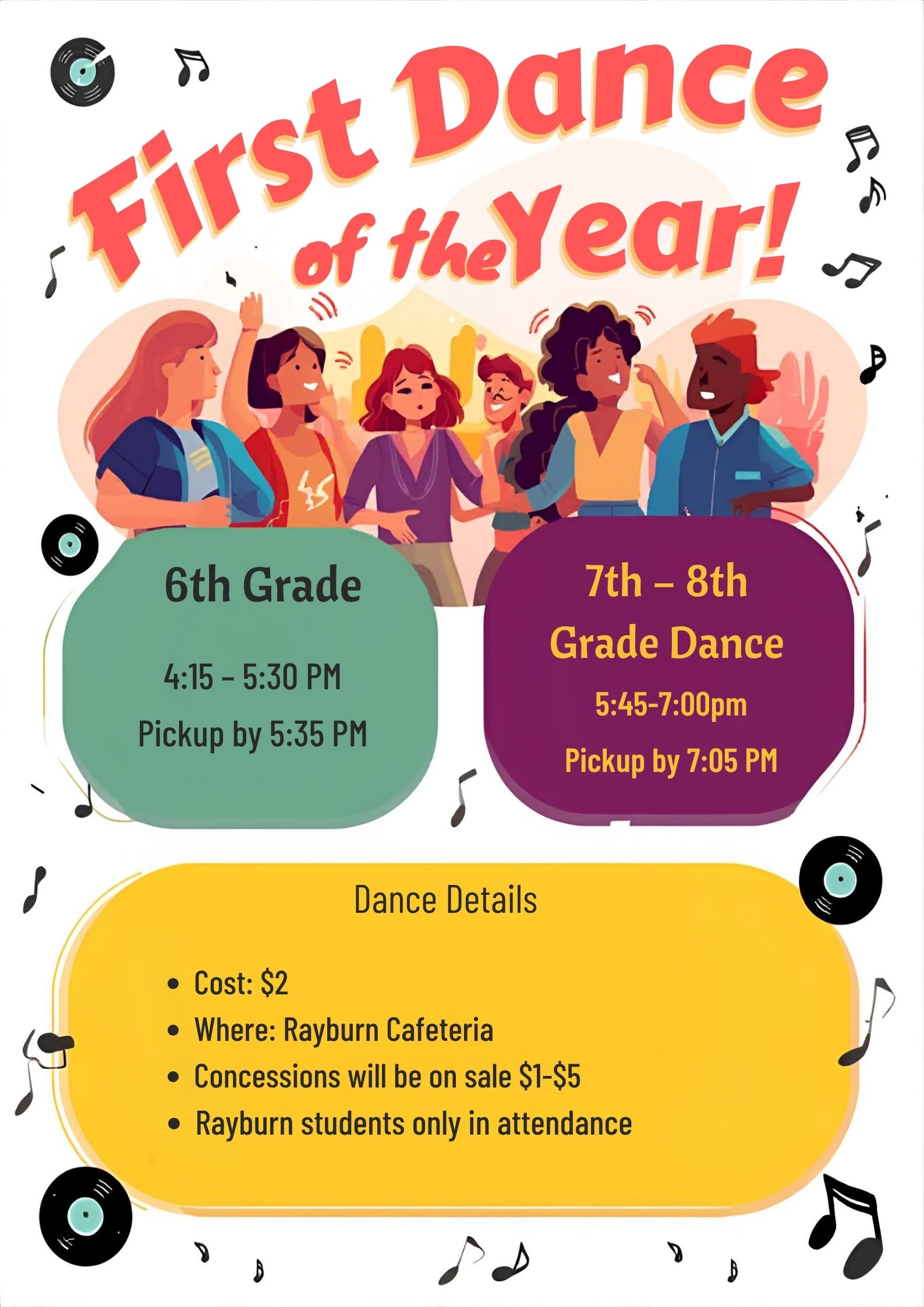 Please note: 7th and 8th graders are not allowed to remain on campus to wait between dismissal and their dance start time.